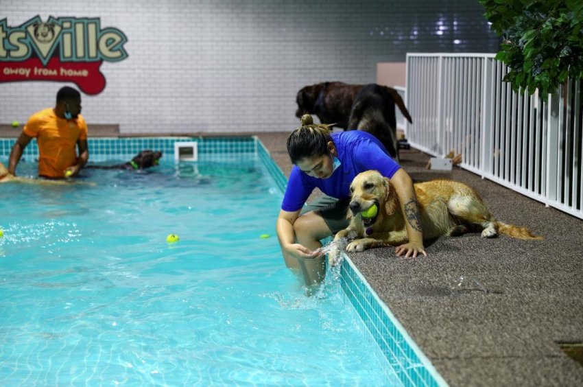 Песиков при этом активно развлекают сотрудники аквапарка.