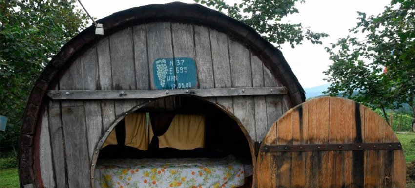 В одном из семейных фермерских хозяйств в Гурии можно переночевать в переоборудованных под мини-гостиницу винных бочках