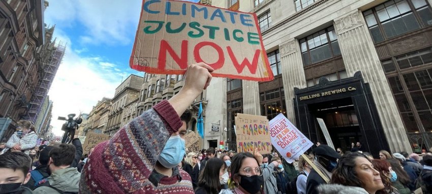 Служба новостей ООН / Л. Куиноньес Молодые экоактивисты принимают участие в демонстрации на климатической конференции COP26 в Глазго.