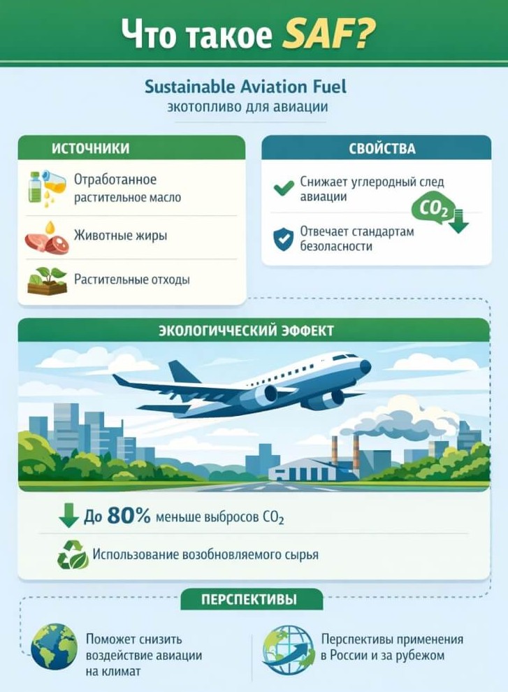 Использование SAF рассматривается как один из ключевых инструментов снижения воздействия авиации на атмосферу. По международным оценкам, такие виды топлива позволяют сократить совокупные выбросы парниковых газов по жизненному циклу до 80% по сравнению с традиционным авиакеросином.